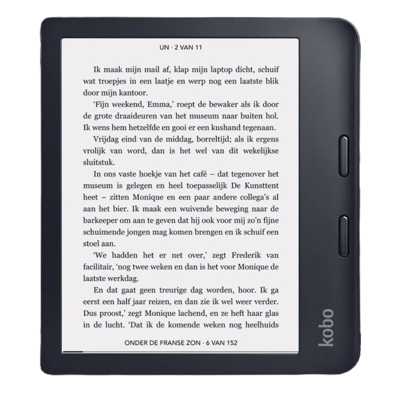 De Kobo Libra 2 is onze favoriete e-reader van dit moment. Het voldoet aan alles wat we verwachten van een top e-reader. Het is een hoogwaardige e-reader met een waterdichte behuizing. Het scherm van 7 inch valt onder middelgroot. Dankzij het lichte gewicht van 215 gram ligt de Kobo Libra 2 fijn in de hand. Qua formaat zit deze e-reader tussen de Kobo Clare HD (klein) en de Kobo Sage (groot) in. Verder heeft het ingebouwde schermverlichting, die zich automatisch aanpast aan het omgevingslicht. Fijn is ook dat het blauw licht filtert, waardoor het prettig aan voelt aan de ogen. Wij kunnen echt uren lezen op deze e-reader. Dit model is ook geschikt om luisterboeken mee af te spelen via een bluetooth koptelefoon. De knoppen zitten aan de zijkant. Dit vonden we op het begin wel even wennen. Helemaal als je oude e-reader knoppen aan de onderkant heeft (zoals dit model). Toch went dit ook wel weer snel. Een topmodel e-reader voor een prachtige prijs.